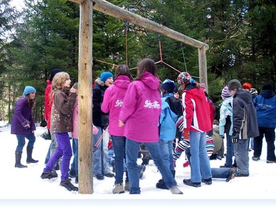 Anschließend ging es zum „Säuresee“; hier war eine Schatzkiste aus der Mitte des Sees zu bergen und als Hilfsmittel standen ein Klettergurt, ein langes Bergsteigerseil, ein Karabinerhaken, ein Sturzhelm und ein großer Baum zur Verfügung. Auch das haben wir gemeinsam hingekriegt.