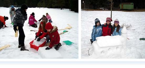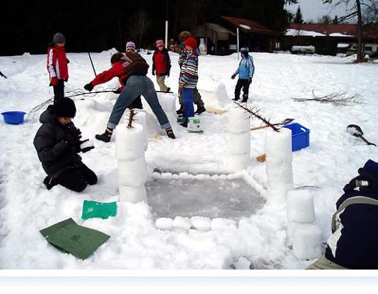Es war am Dienstagmorgen beim Frühstück, als Frau Meyer mit Spannung verkündete, dass wir ein Schneedorf bauen sollten. Dann endlich gingen wir zum Fußballplatz, auf dem noch immer eine hohe Schneedecke lag. Vor Ort bekamen wir Eimer, Schaufeln und Kisten zum Bauen. Nach einer Weile standen schon eine Kirche, drei Villen und das Museum. Später kamen noch ein Eisstadion, ein Bauernhof, ein Wohnhaus, das Rathaus und eine zweite Kirche dazu. Aber trotzdem wird das Dorf wohl nie bewohnt sein.