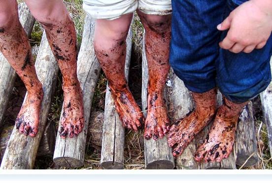 Schließlich kamen wir zu einem Moorloch, in das man hineinwaten konnte – allerdings kam man nicht mehr ganz so sauber wieder heraus – daher zogen alle die Schuhe aus um in das Moor zu treten.