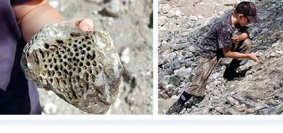 Dann kamen wir am Wasserfall mit anschließendem ausgedehnten Flussbett an. Der Fluss hat hier sehr viele unterschiedliche Steine angeschwemmt. Sogleich machten wir uns auf die Suche nach besonderen Exemplaren – mit Glück konnte man auch eine Versteinerung finden.