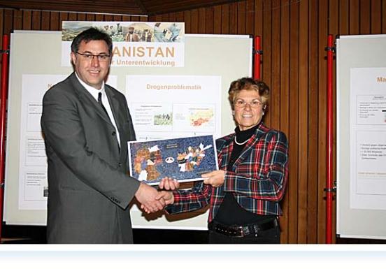 Als Geschenk für unsere Schule überreichte Frau Erös eine in Afghanistan hergestellte Einlegearbeit aus Halbedelstein, z. B. aus Lapislazuli, das Deutschland mit den Bundesländern und Afghanistan mit den Provinzen zeigt. Es soll den Dank der afghanischen Kinder und ihrer Eltern an die deutschen Förderer ausdrücken.