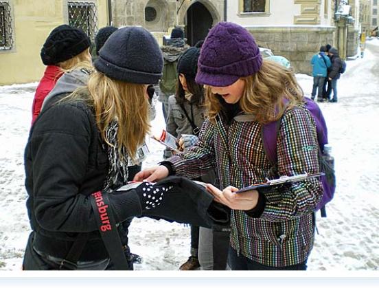 Die nächsten sechs Seiten des Fragebogens gingen über Stadtgeschichte, Sehenswürdigkeiten und Essen. Die Fragen waren so gestellt, dass wir entweder zuerst zu den Orten gehen mussten, um die Antworten zu finden, oder wir mussten Passanten fragen. Unter anderem fanden wir das Maß "Fuß" auf einer Steinmauer in der Nähe des Rathauses und mussten das Gewicht einer alten, schweren Eisenkette schätzen.