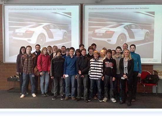 Vom 8.-12. Februar 2010 hatten 19 Schüler/innen und ich die Möglichkeit ein Praktikum bei der Firma Audi zu absolvieren. Wir haben einen Einblick in die verschiedensten Berufsfelder, Abteilungen und Bereiche von Audi erhalten. Jeden Tag haben wir einen anderen Bereich der Audi besichtigt und so näher kennengelernt. Dabei haben sich die Mitarbeiter immer sehr viel Zeit für uns genommen und sich sehr viel Mühe gegeben ihre Vorträge für uns möglichst interessant zu gestalten.