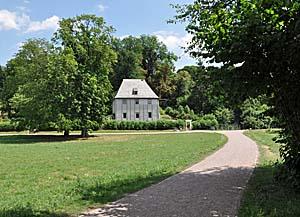 Danach ging`s wieder in fröhlichere Gemäuer, nachdem wir leider die russische Kirche über der Gruft wegen eines Gottesdienstes der Gemeinde nicht besuchen konnten, und zwar in Goethes Gartenhaus, das ihm von Herzog Karl August geschenkt wurde, um ihn an Weimar zu binden. Dort gab es auch wieder mal eine Führung in original thüringischem Dialekt.