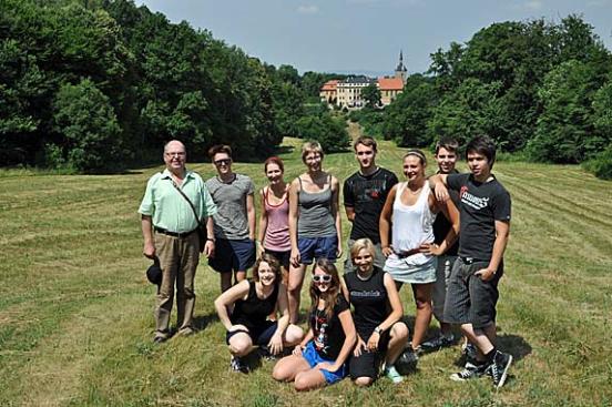 Die eigentlich geplante Wanderung durch die Ilmauen ließen wir wegen der drückenden Hitze ausfallen, da wir uns vor lauter Schwitzen kaum mehr rühren konnten. Weiter ging es dann erst wieder am Nachmittag mit einer Fahrt zu Schloss Tiefurt, dem Sommersitz Anna Amalias. Dort bekamen wir einen immer tieferen Einblick in das Leben der Herzogin, in dem auch Goethe, Schiller, Wieland, Herder und natürlich ihr Sohn Karl August wichtige Rollen spielten. Natürlich erkundeten wir, wenn auch murrend ob der Hitze, den Schlosspark. Historisches Ereignis des Tages: am Abend regnete es, das erste Mal seit ca. fünf Wochen in Weimar. Dienstag war der Regen vorbei, es herrschte die gewohnte sommerliche Wärme, der Leistungskurs stand im Wielandgut in Oßmannstedt und schwitzte. Wieland war, wie wir nun wissen, der Prinzenerzieher von Anna Amalias Sohn. Nach relativ kurzer Dienstzeit zog er sich auf ein schönes großes Landgut zurück und bezog astronomisch hohe Renten, die ihn und seine Familie (mit nur 14 Kindern) recht gut über die Runden brachte.