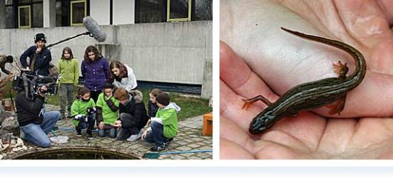 Das Filmteam setzte eine Unterwasserkamera ein, während einige Schüler/innen ein kleines Schauaquarium mit einem Teichmolchpärchen anlegten, um Nahaufnahmen zu ermöglichen. Sebastian Liese erklärte den jüngeren Schüler/innen souverän alles über die Biologie und das Leben der Teichmolche.