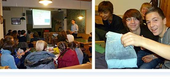 Nach einer kurzen Einleitung zu den Einsatzgebieten der Freiwilligen Feuerwehr wurde uns ein Video zur Einstimmung zum Thema Brände gezeigt. Das Video zeigte einen Brand in der Schweiz. Dort fing ein Zug Feuer und auch die Häuser der Umgebung wurden in Brand gesteckt. Man sah verschiedenen Rauch, über den man uns auch sofort etwas erklärte. Da der Rauch auch für die Einsatzkräfte wichtig ist, nannte der Gruppenführer der Freiwilligen Feuerwehr auch die Inhaltsstoffe, wie zum Beispiel CO, CO2, Blausäure, Phosgen und HCl. Der Brandrauch hat verschiedene Eigenschaften, vor allem ist er aber ätzend und giftig!