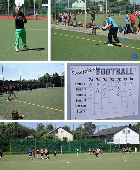 Auf eher unerforschte sportliche Gebiete begaben sich unsere Schülerinnen und Schüler der 7. Jahrgangsstufe. Am "American Sports Day" hatten sie die Möglichkeit in zwei der beliebtesten Sportarten der US-Amerikaner hinein zu schnuppern und ihren Jahrgangsstufensieger im Baseball und Football zu ermitteln. Jede Klasse teilte sich hierfür in zwei Gruppen, um zuerst eine Einführung in die jeweiligen Techniken, Taktiken und Regeln der Sportarten zu bekommen. Im Anschluss begannen dann die hart umkämpften Turnierspiele, wobei die Baseball-Teams zweimal in der "defense" und zweimal in der "offense" sowie an einer Technikstation ihr Geschick mit dem ungewohnten Schläger unter Beweis stellten. Die Football-Teams der einzelnen Klassen kämpften währenddessen in vier Spielen um "Touch-Downs" und Punkte.