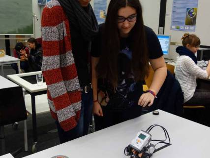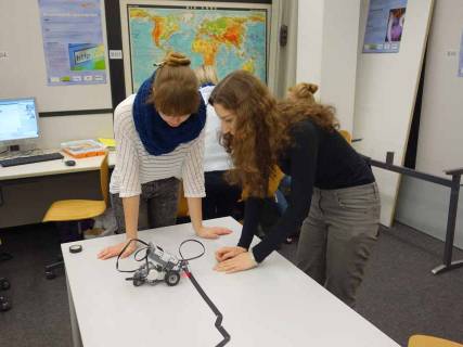 Einige Schülerinnen hatten viel Spaß dabei, unter Anleitung von Frau Hadinger und Frau Bauer (THI) Roboter so zu programmieren, dass sie verschiedene, teils auch schwierige, vorgegebene Raumwege abfuhren. Nicht immer funktionierte dies auf Anhieb, aber aus Fehlern lernt man und zuletzt verließen doch alle Schülerinnen dieses Workshops den Computerraum mit dem Erfolgserlebnis, die Roboter auf den richtigen Weg (egal ob kurvig oder gerade) gebracht zu haben.