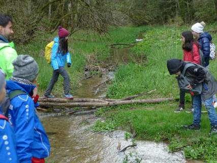 Danach wurden wir in vier Gruppen aufgeteilt. Jede Gruppe war zu einer anderen Zeit an einer Station. Frau Ring zeigte uns wie man die Bäume messen kann, bei Tobias mussten wir Tiere suchen, bei Herr Liepold lernten wir in welcher Höhe des Baumes verschiedene Tiere leben und Magret brachte uns bei, wie man verschiedene Baumarten unterscheiden kann. Anschließend haben wir eine Erlebniswanderung gemacht. Diese bestand daraus, dass wir den Weißbach überqueren mussten. Dazu mussten wir die Schuhe und Socken ausziehen, da wir ihn barfuß überqueren mussten. Außerdem sind wir durch ein Schlangengebiet gewandert. Dort haben wir aber keine Schlange gesehen. Danach mussten wir über eine Brücke aus Baumstämmen gehen. Als wir wieder im Schullandheim angekommen waren, hatten wir bis zum Abendessen Freizeit. In dieser konnten wir duschen, uns im Zimmer beschäftigen oder draußen auf dem großen Gelände spielen.