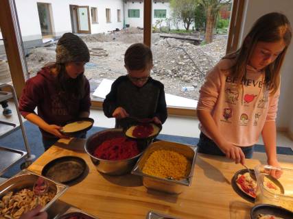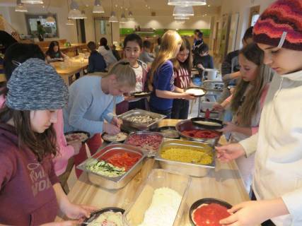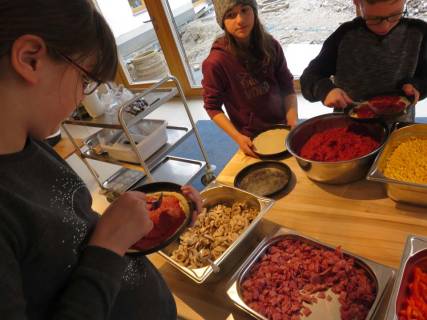 Im zweiten Durchgang probierten wir eine andere Taktik aus, mit der wir es fast alle schafften, das Ziel zu erreichen. Bevor wir uns an den dritten und letzten Versuch wagten, mussten wir unsere knurrenden Bäuche füllen. Wir beschlossen, eine Spielpause einzulegen und machten uns auf den Weg zum Speisesaal, wo wir unser Mittagessen an diesem Tag selber zubereiteten – Apfelkuchen und Pizza.