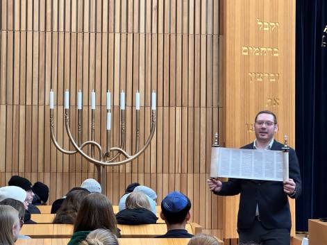 Ein Teil der Gruppe besuchte zunächst die Synagoge der jüdischen Gemeinde in Regensburg. Dort wurden die Jugendlichen vom Rabbi empfangen und in den hellen Hauptraum geführt. Sofort fiel der Blick auf zwei große Türen, auf denen hebräische Wörter zu lesen waren. Dahinter verbirgt sich der Toraschrein, in dem die Torarolle aufbewahrt wird. Diese entsteht in aufwendiger Handarbeit und wird nur zu Gottesdiensten hervorgeholt. Auch wenn die Türen und der Schrein verschlossen blieben, erhielten die Schülerinnen und Schüler durch eine Nachbildung einer Torarolle sowie eine kurze Lesung auf Hebräisch einen anschaulichen Eindruck davon, was sich dahinter verbirgt. Mit etwas Kombinationsgeschick gelang es den Klassen sogar, die Bedeutung der hebräischen Schriftzeichen zu entschlüsseln: Sie stehen für die Zehn Gebote.